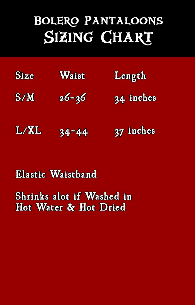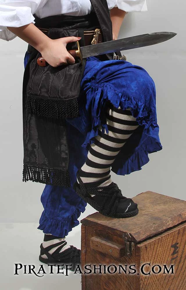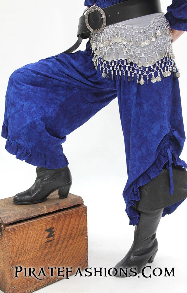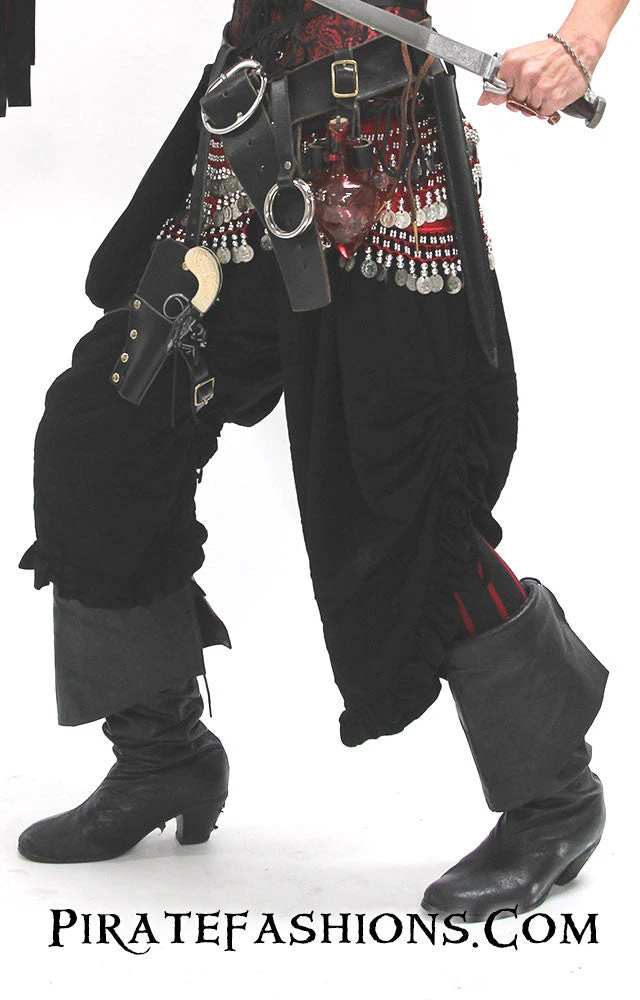 Here be the first set of pantaloons we offer fer roguish women who be lookin fer an outfit that allows them a wide range of motion.  With a comfortable wide leg design with an adjustable pull up ruffle at the sides, these pants be perfect fer lady pirates looking for a comfortable outfit that’s both stylish and battle ready. These pantaloons can be used in a range of looks, n’ can be dressed up fer a perfect commandeering captain look, or dressed down fer the common tomboyish wenchÂ
