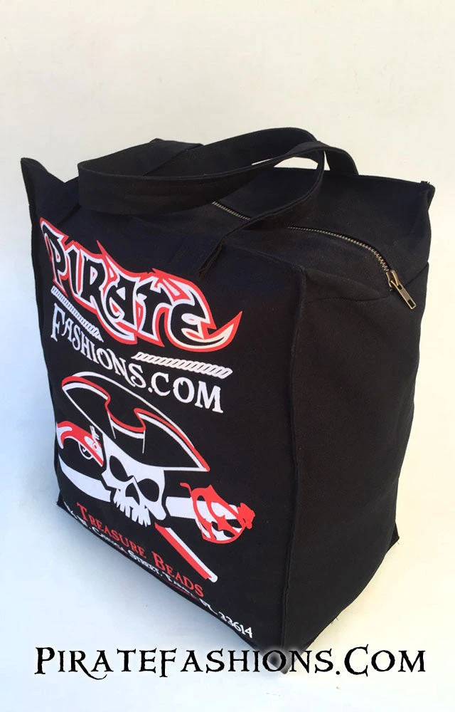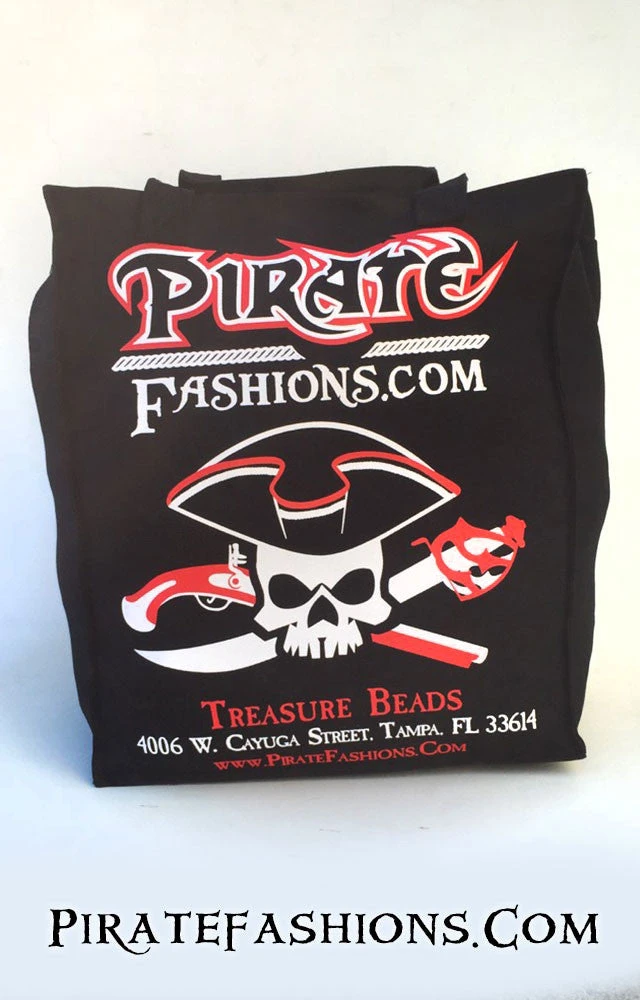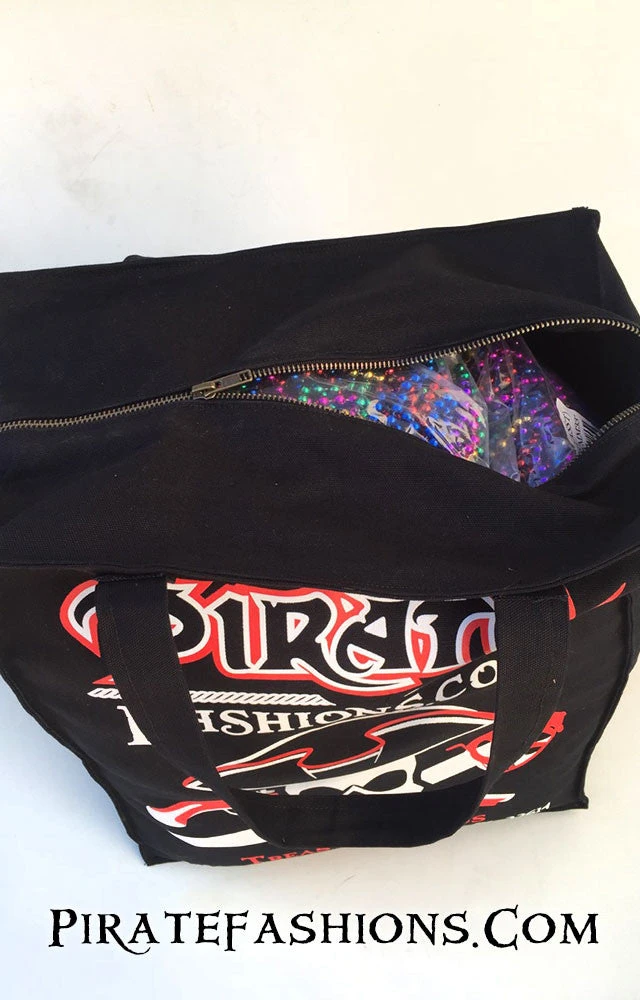 Here be arrrrrr Gasparilla bead bag, hand made right here at Pirate Fashions. Made of 100% cotton canvas, not that cheap polyplastic that everyone else be using. Designed with a 22 inch handle that ye can carry over yar shoulders or with yar hands. The zipper be made of brass. The seam be sewn twice fer extra strength. Our logo be silk screened boldly on one side and ye’ll be proud to carry all yar beads or any other treasures to a parade or anywhere ye might travel.