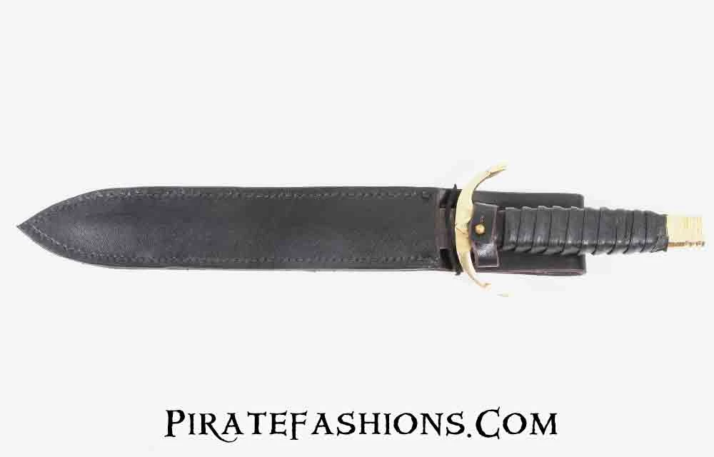 This be of arrr own design based on two different historical daggers. It’s not available anywhere else, as we arrrr having this custom made fer us. Features a solid brass anchored guard and pommel. Nice leather wrapped grip and includes a black leather sheath with button retaining strap. Perfect fer the Golden Age and Late Pirate era. Comes with the PF Anchor Makers Mark.