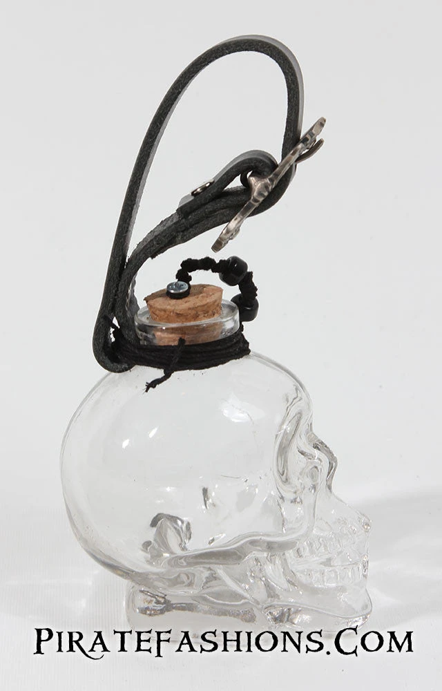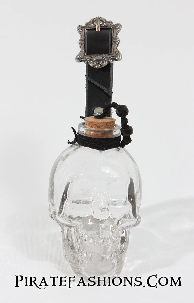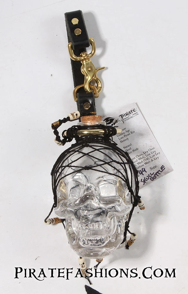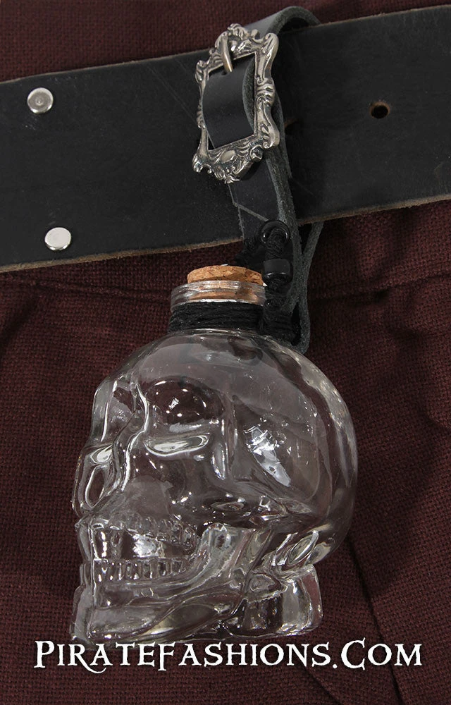 After a grand search around the 7 seas, we have acquired a hard to find skull bottle. When ye be needin a unique and piratical bottle fer yarrrrr precious rum, this be the bottle fer ye. Its leather straps will fit onto any belt up to 3 inches wide and it has a retaining tie to avoid losing yar cork. The retaining ties are made right here in arrrrr fine shop n’ each is unique!