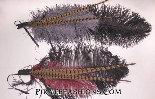 Based on yar color n’ style choices, we will customize a color coordinated array of plumes to compliment yar fine hat, arrrgh! Includes a ribbon to secure the bundle to yar hat. Arrrr feather bundles will only work with a properly cocked hat, which has ribbons attaching the brim of the hat to the crown. The ribbons create a pocket that the bundle slides into between the crown and the brim, and you pull the front ribbon through and tie over top of the cocking ribbons. Designed for arrr fine custom pirate hats, not really designed for the affordable mass produced hats or the leather hats (but can be made to work).