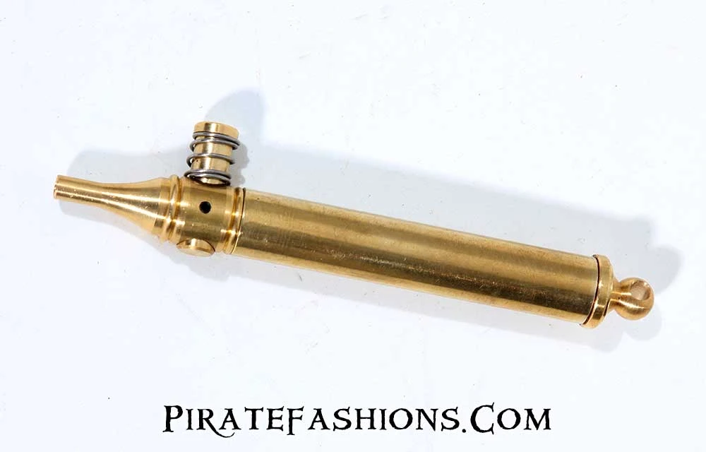 Here be free flow pan primer to deposit black powder to the pan of yar flintock firearm. Holds 135 grains of powder, best to use FFFg or FFFg powder for priming.