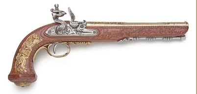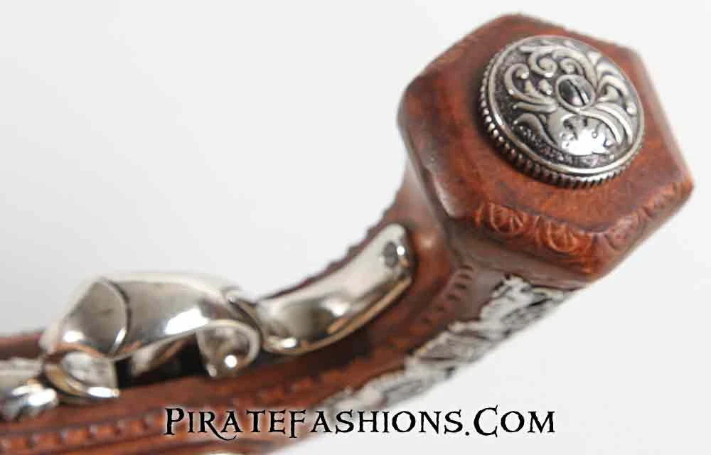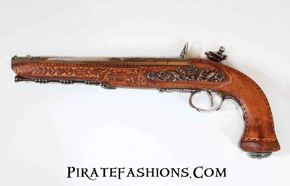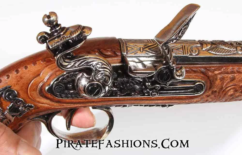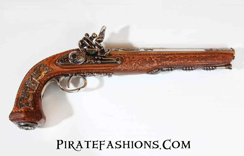 Here be a fancy silver version of the French 1810 dueling pistol.  Quite unique as it features an fancy silver engraved barrel, lock, trigger guard, side plate n’ butt cap.  This style would’ve been seen at  the Court of Versailles. Perfect paired to go with the Pirate Court Outfit, yarrrr!