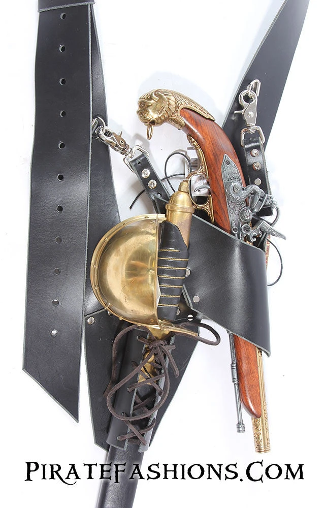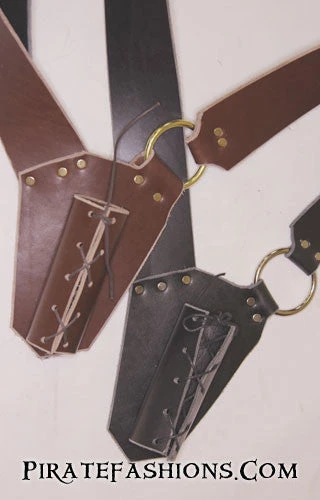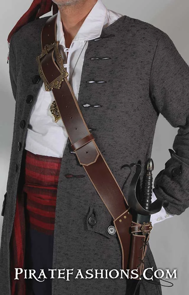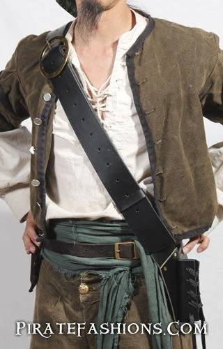 Doing research on what sailors really wore, we came across a real example of a Navy baldric and patterned this one after it. Due to the cramped nature of ships, with only small hatches between decks, only a baldric with the sword pointing straight up and down would work. Land based baldrics used by cavalry could be angled front to back, for a salty seadog aboard a ship that just wouldn’t work. This set up also works well in a crowed festival, so ye don’t bang everybody around ye with yer weapon. It is designed around on the buttock rather that around the hip and is comfortable when walking as yer sword won’t hit your own leg.