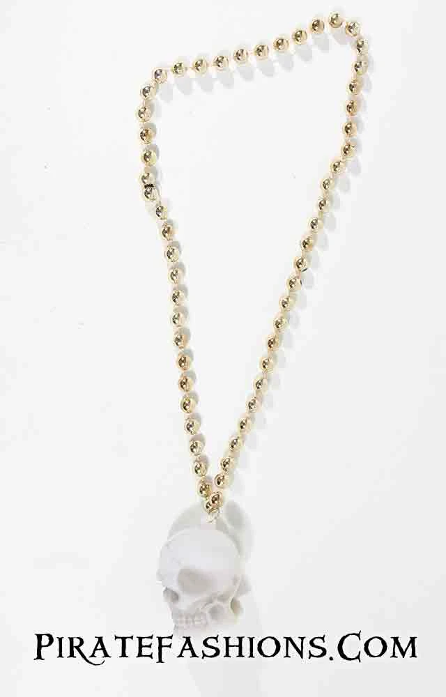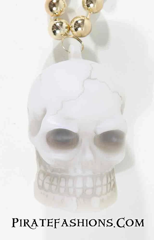 Pirates be fond o’ carrying skulls and here be a large plastic skull that lights up! A switch turns on the flashing light n’ it comes on a 33 inch long 12 mm  gold bead strand. The battery can be replaced when it runs out of juice.Â