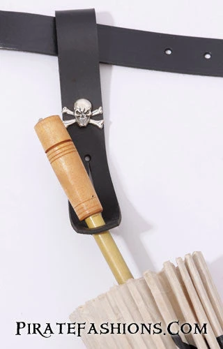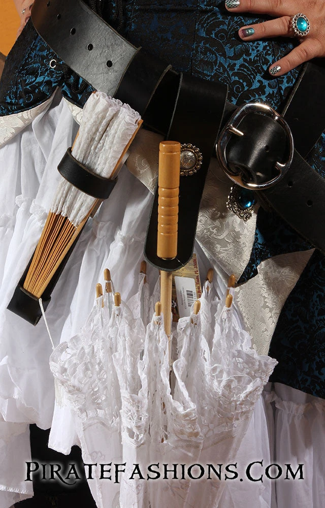 Here be a handy leather strap to hold yer parasol on yer belt when yer otherwise engaged so ye don’t put yer pretty parasol down n’ leave it for other pirates to steal! This solves the issue of lost parasols and has a pretty circular concho to give it some flair.