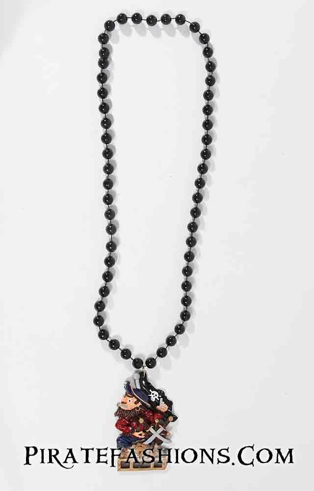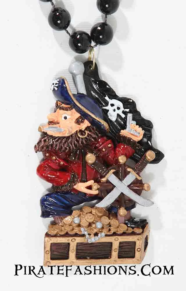 This bead be a pirate with a Jolly Roger flag to his back, standing on a treasure chest full of golden doubloons holding a ship’s wheel with two cross swords.  Made of resin and beautifully hand painted. Comes on a 33 inch long 12 mm black bead strand.