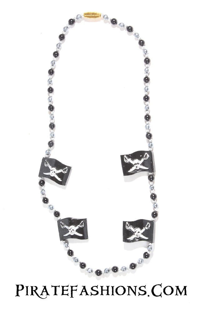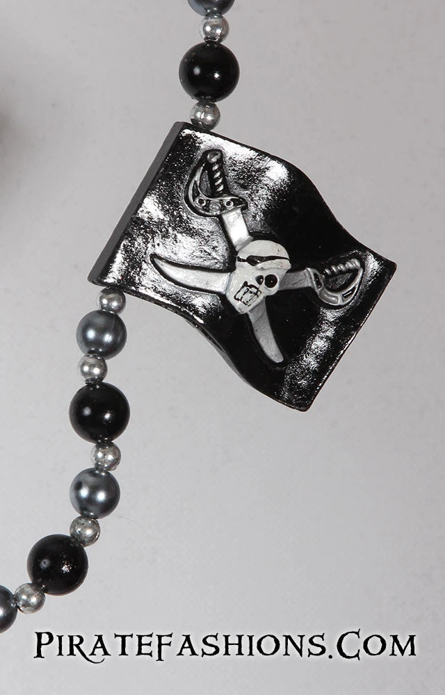 This be one fer every flag waving pirate. Comes with 4 poly resin Jack Rackham flags with crossed swords in black n’ silver. This be a hand strung 40 inch 10, 8 & 6 mm bead strand.