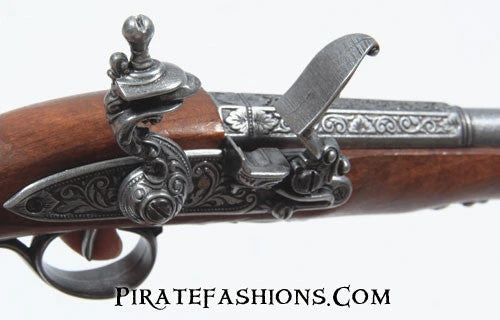 This pirate flintlock pistol features an elegant physique and attractive engraving that runs half way down the barrel from the hammer, and carries throughout all the metal furniture, including a decoratively engraved butt plate. Stock is made of wood.