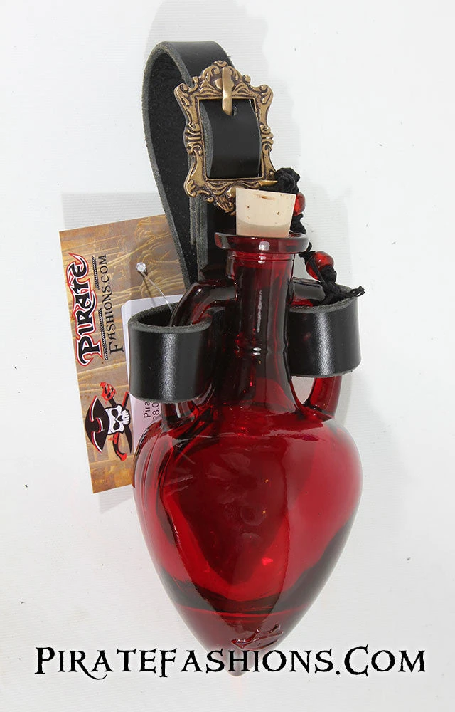 Here be a beautiful pirate’s heart bottle. This be mounted on a black leather harness to attach to yar belt. Comes in two options: Royal Blue bottle or Blood Red bottle, will come with with cork secured with corded beads and either brass or nickel hardware. Will fit any belt up to 2.5 inches wide.