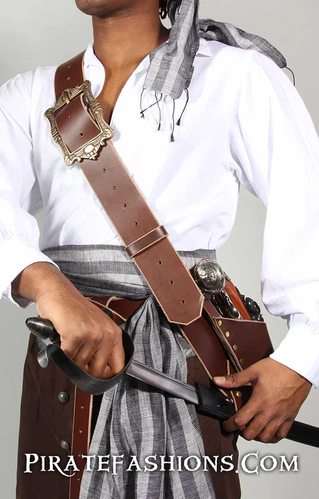 The grand thing about being a pyrate is carrying lots of dangerous looking weapons. The best way to do that would be with arrr new shoulder baldric. We crafted this flexible n’ complete Leather Baldric system ourselves – you can add holsters and dagger holders. If ye be needing a left handed baldric, look no farther!