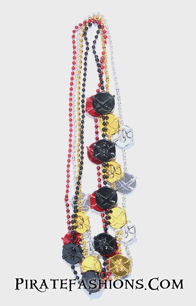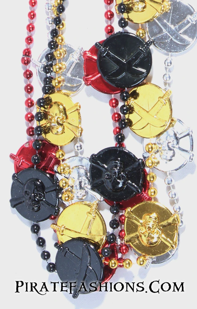 This be a grandly popular parade throw beads fer all kinds of pirate loving souls. The big plastic medallion with a skull on one side and cross swords on the other be very sough after in the crowds. Comes packed in the assorted 4 color combination of black, gold, red and silver. Comes on a 40 inch 7 mm bead strand. Come by the dozen or in a boxed cased of 12 dozen.