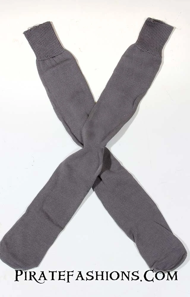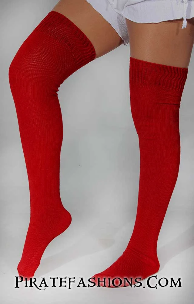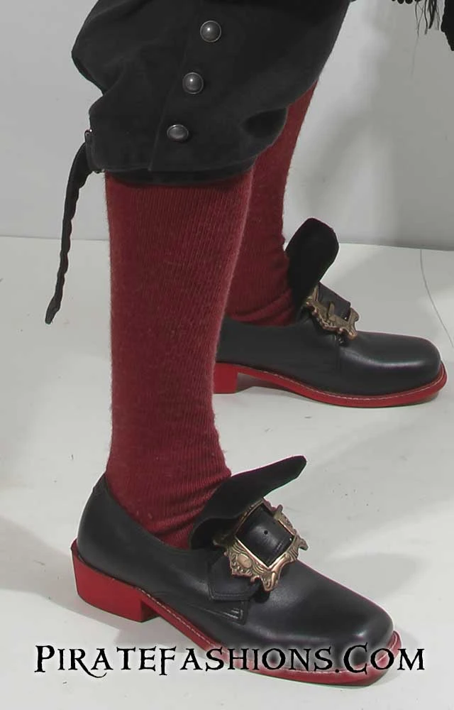 These socks be a real favorite with pirates n’ wenches alike. Perfect for those buccaneer who don’t like striped stocks, just one simple color, nothing fancy. Solid sock were popular with sailors in the 18th century n’ these be a fine 97% cotton knee sock, which be perfect for warm weather pirate ports. Cotton breathes very well in hot climates. Comes in a large variety of common pirate color combinations. 3 inches of elastic ribbing at the top. Great with boots or our rope sandals.  These socks be made in the USA. We carry an extra wide sock in the red n’ black at the bottom.